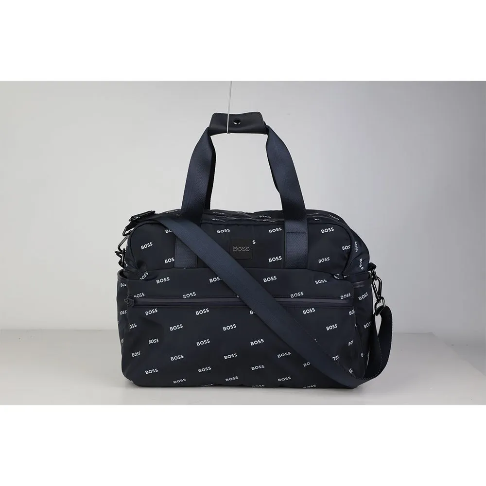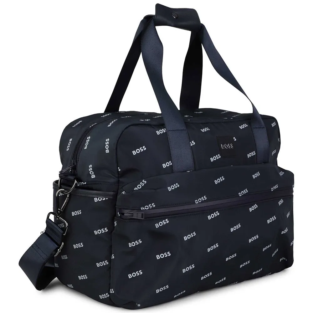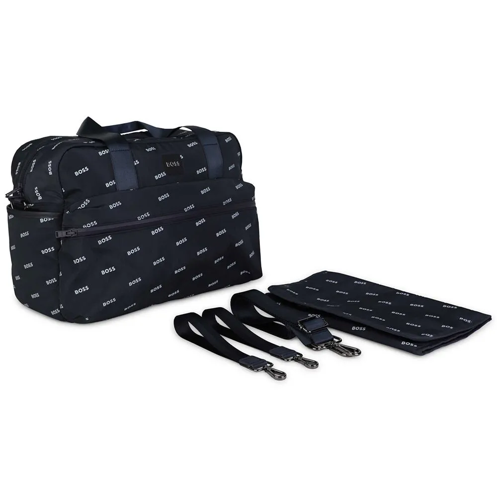 This practical BOSS-print changing bag features mesh pockets on the inside and pockets on the front.