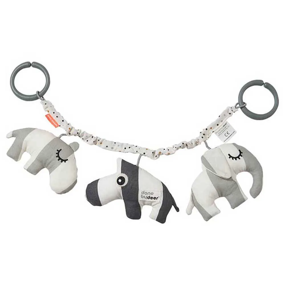 The elastic pram toy is flexible and easily attachable with toy links to a pram, stroller or a car seat hood.