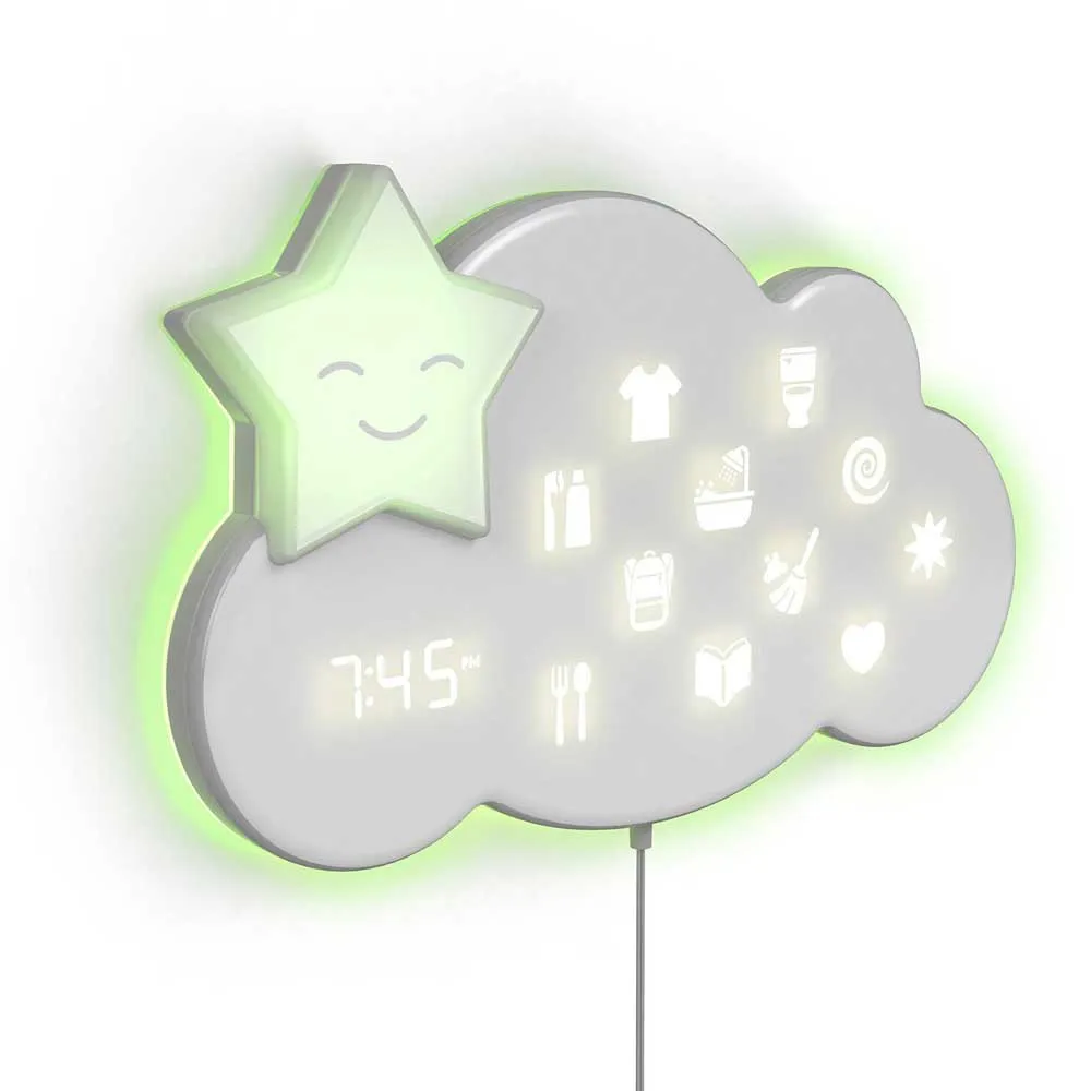 – Wall-mounted, 3-in-1 interactive routine helper, sleep trainer, and nursery sound machine for use from newborn to child (Ages 0-8 years)