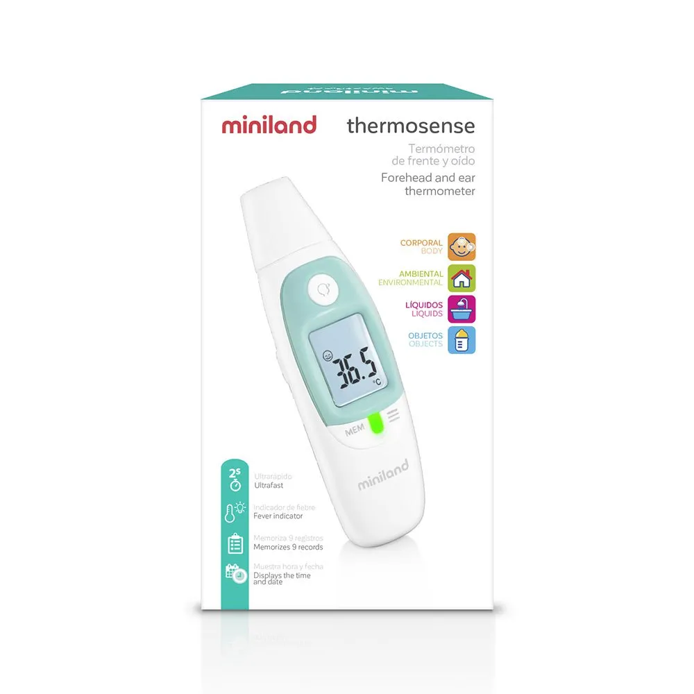 For ear and forehead, objects and room temperature. Thermosense is an infra-red contact thermometer characterised by its design and ease of use. It accurately measures on contact with the ear or forehead, as well as being able to measure the temperature of the bottle, baby food, bath water and room temperature. It incorporates a fever indicator and stores up to 9 readings.